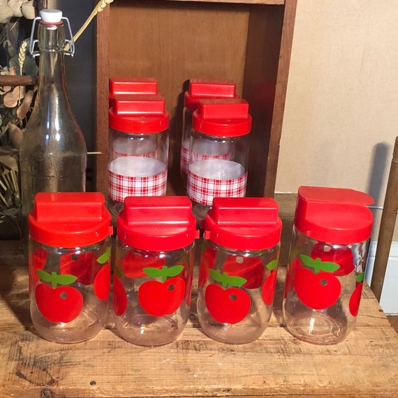 Pair Of Retro Glass Jars Red Lids Lolly Craft Storage Vintage